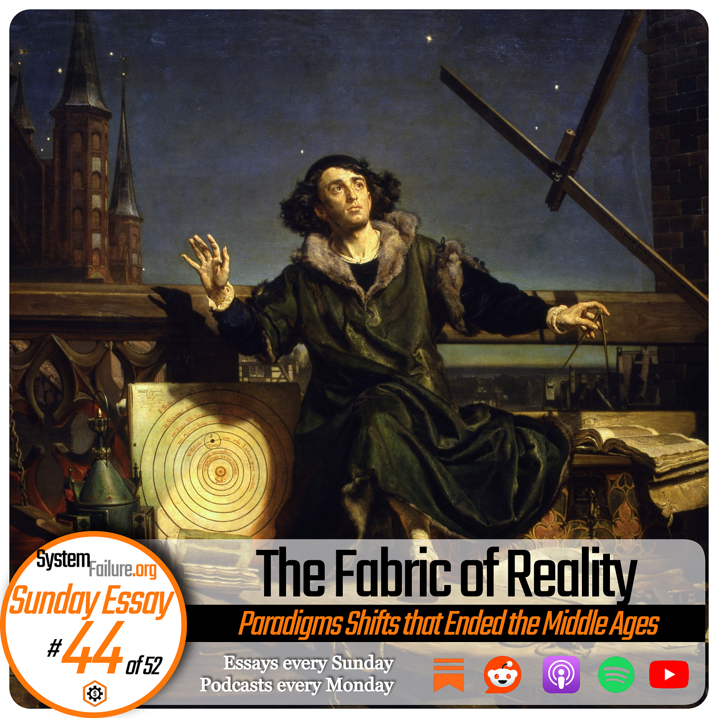 Authorities who govern human economic systems endorse versions of reality that are economically expedient for the ruling class. Consequently, when economic systems lapse into dysfunction, bedrock conceptions of reality are also overturned as collateral damage. A transition from polytheism to monotheism attended the decline of the slave-based economy of Rome. The transition away from feudalism during the Renaissance was similarly marked by the discovery of perspective, the Protestant Reformation, and the Scientific Revolution. These paradigmatic shifts were nothing less than a rending of the very fabric of reality itself.