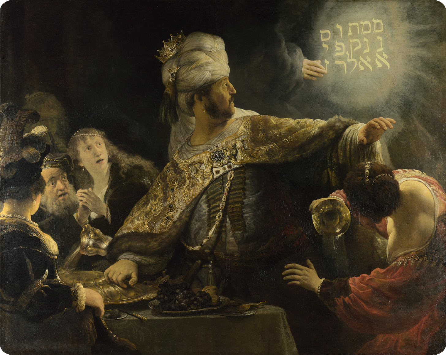 50 years after the conquest of Jerusalem, Babylon was ruled by Nebuchadnezzar’s grandson, Belshazzar. The biblical book of Daniel recounts the story of this king at a feast, when a ghostly hand suddenly appears and scratches on a nearby wall the strange words “mene, mene, tekel, upharsin”.