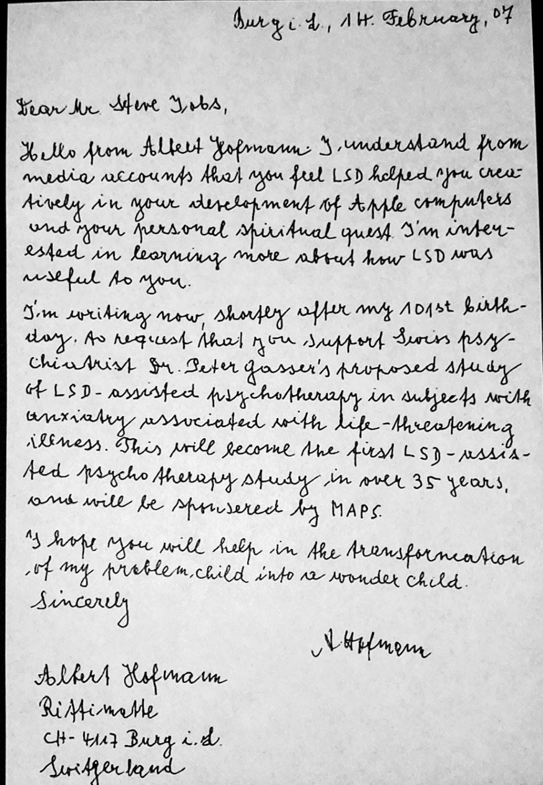 Albert Hofmann penned a letter to Steve Jobs in 2007, after his innovation of the iPod took off. Jobs had been so open about the impact of LSD on his revolution of the Apple computer corporation that Hofmann wanted to open a dialogue during the final years of his life.